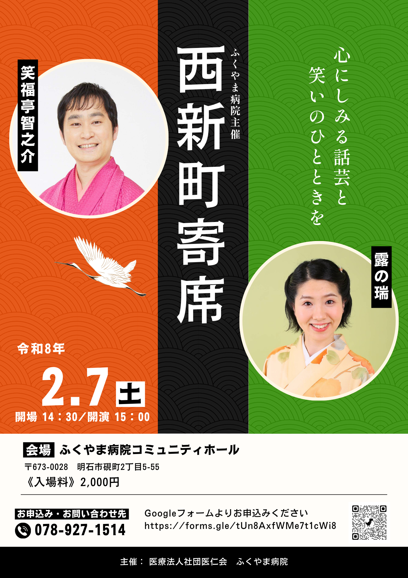 2月7日(土)に笑福亭智之介さん・露の瑞さんをお招きして落語会を開催します。