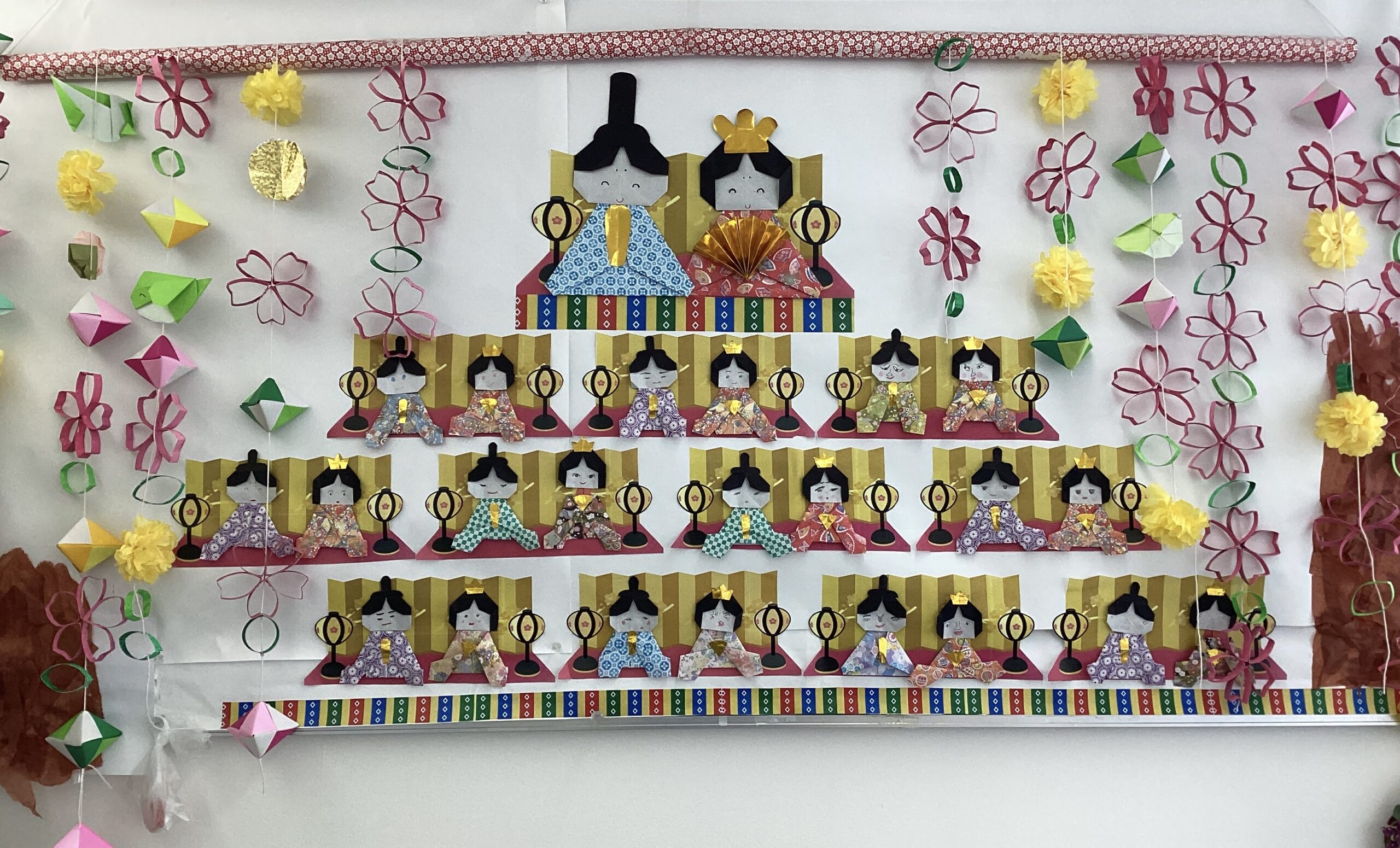 トイレットペーパーの芯に色を塗り花の形に繋げたり折り紙で雛飾りを作成しました。
