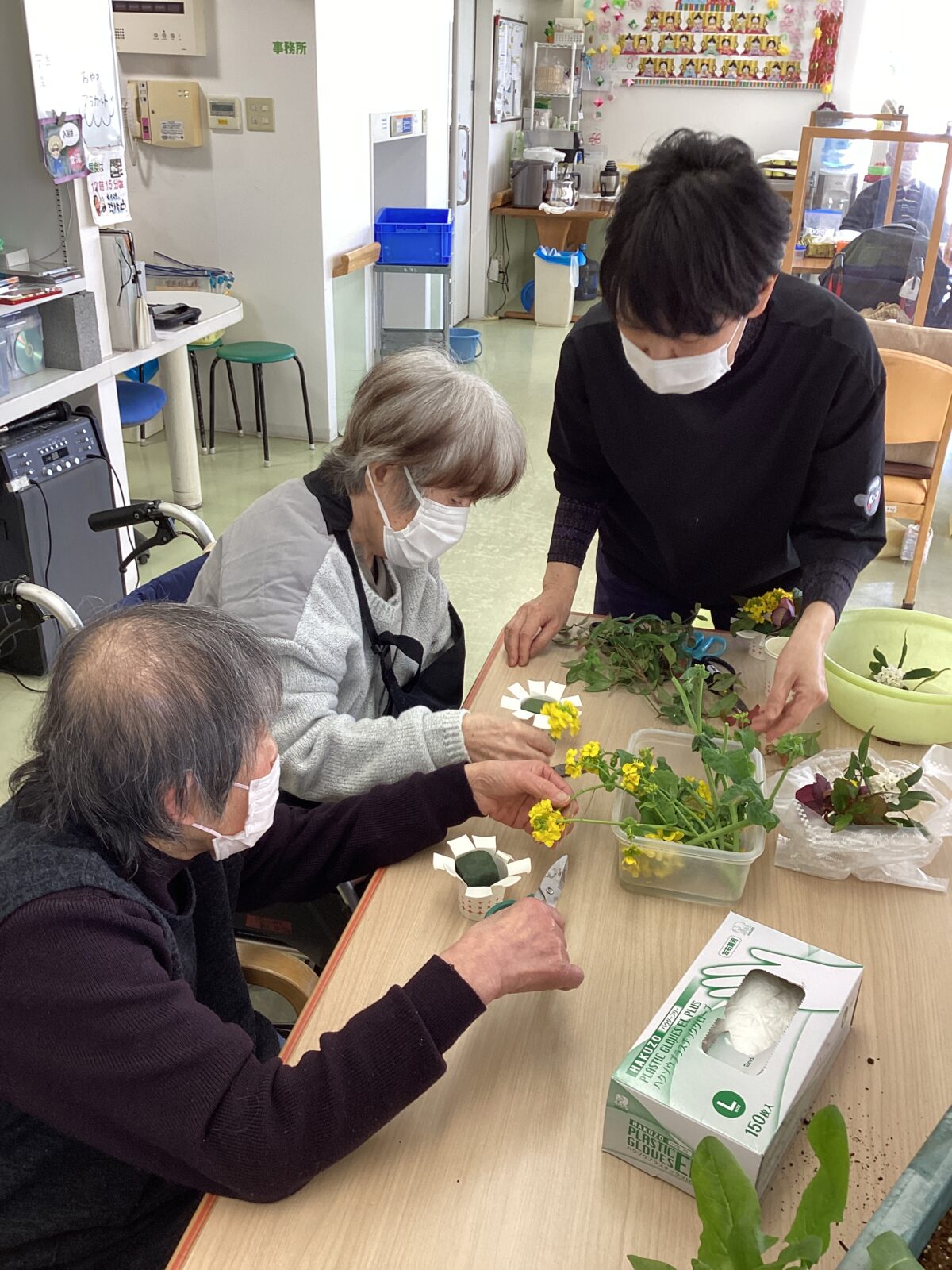 デイケアで育てている季節の花々に触れながらフラワーアレンジメントの時間を楽しみました。